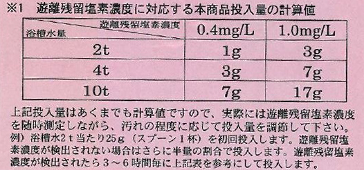 下記の表を参考に、浴槽水(プール水)に直接投入してください。